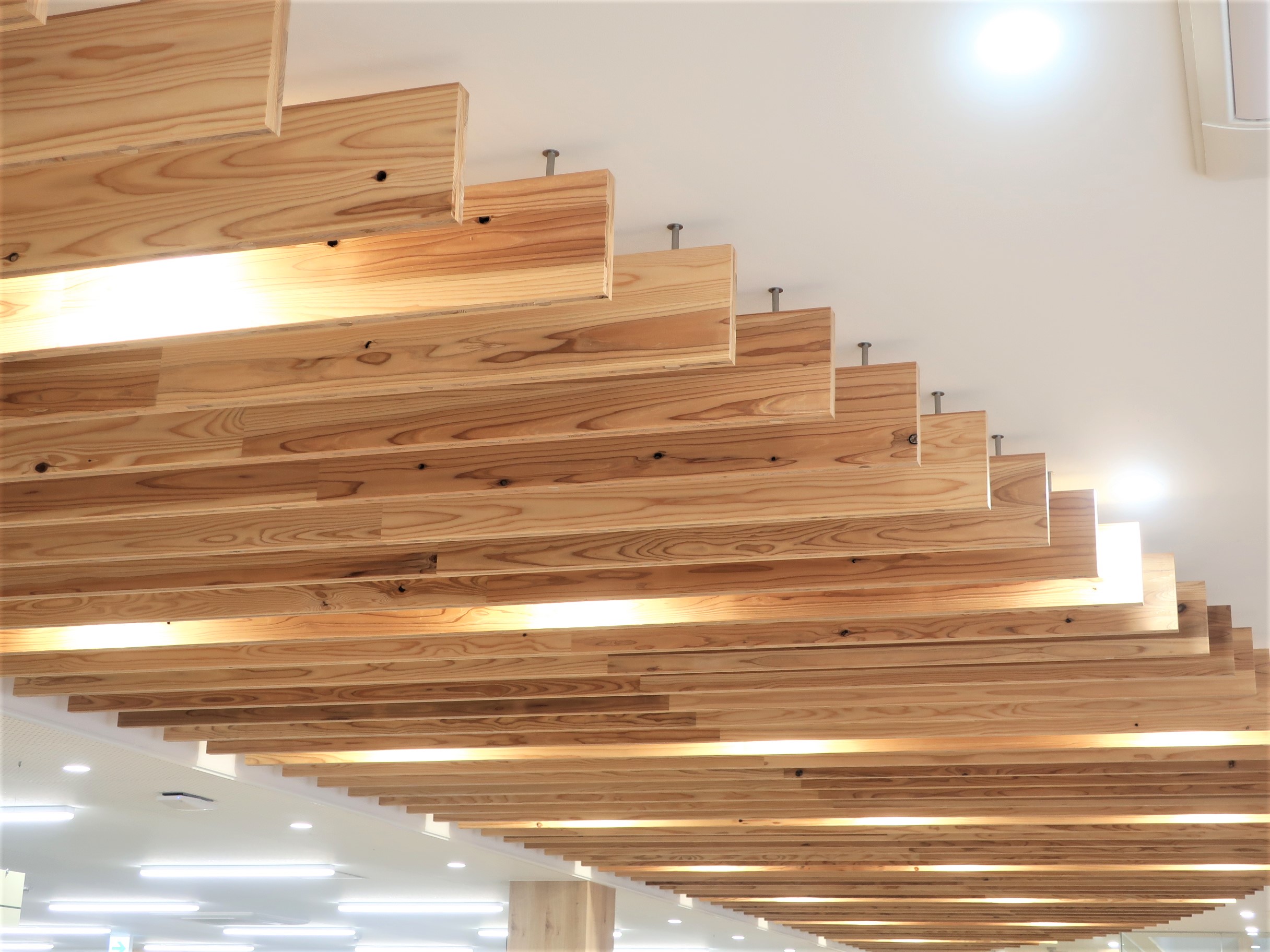 地元・美咲町産材が利用された天井ルーバー(岡山県美咲町の新庁舎)