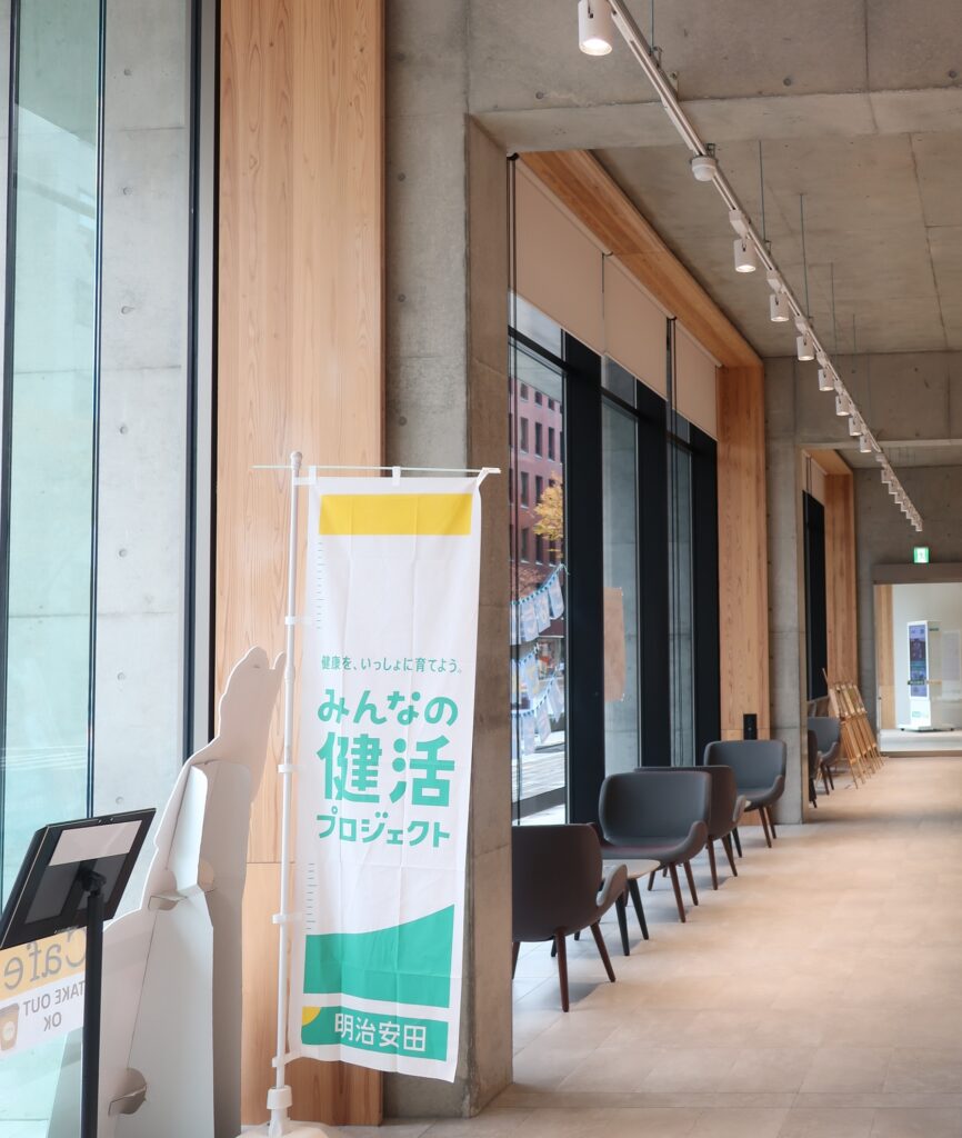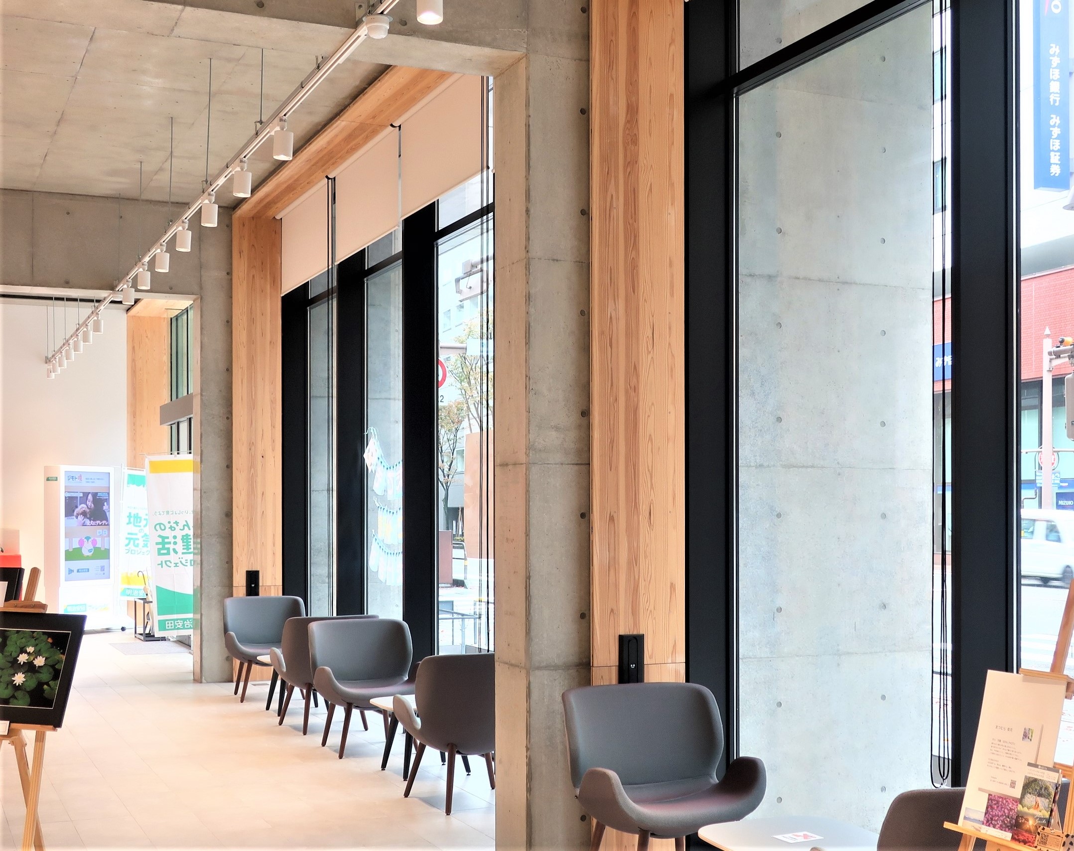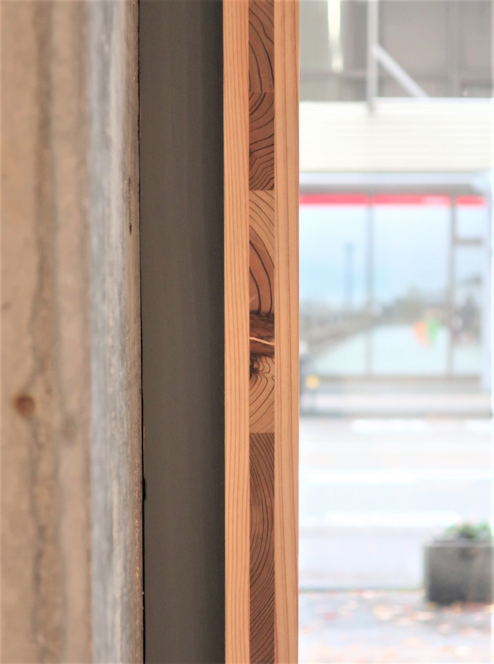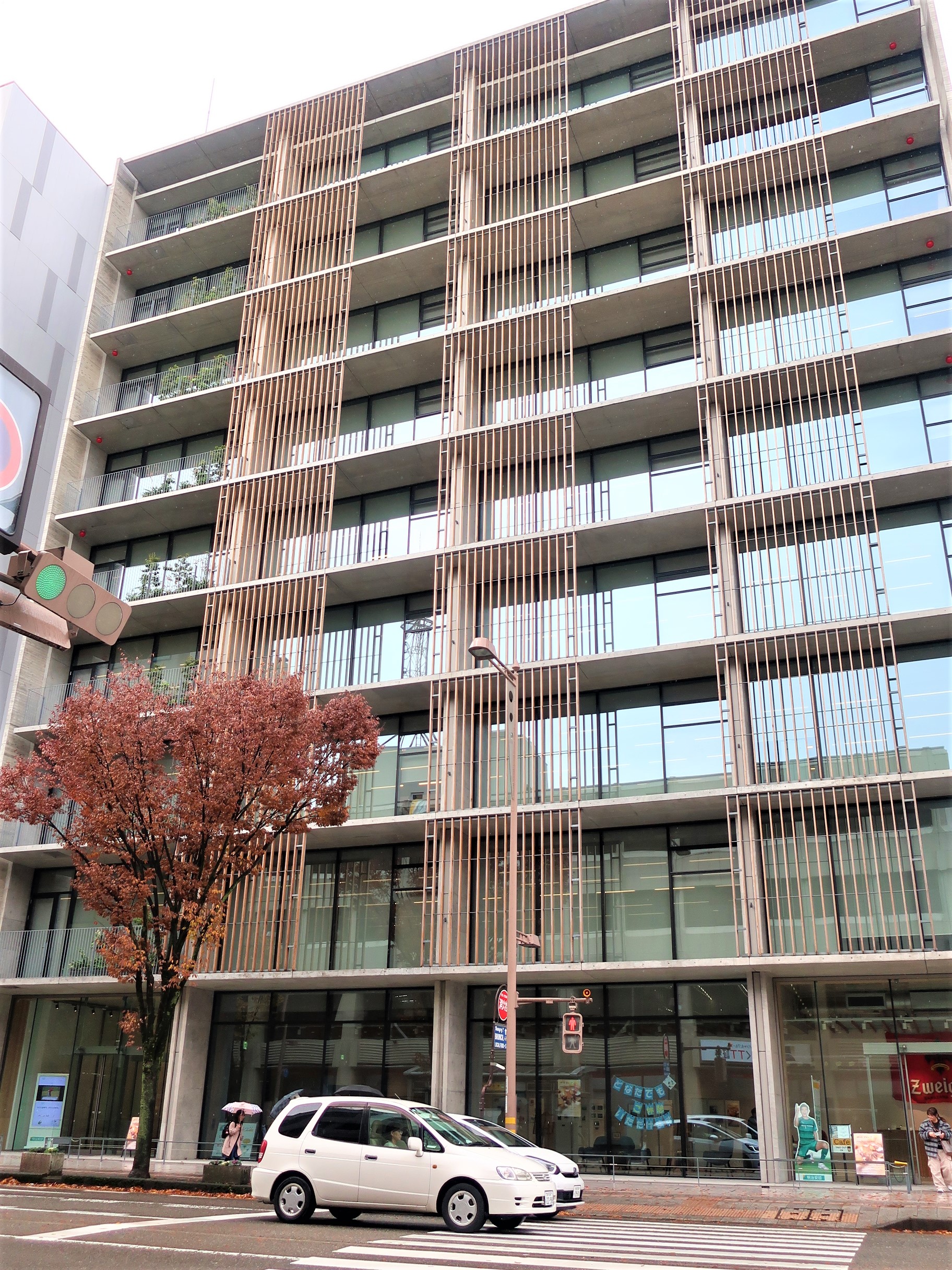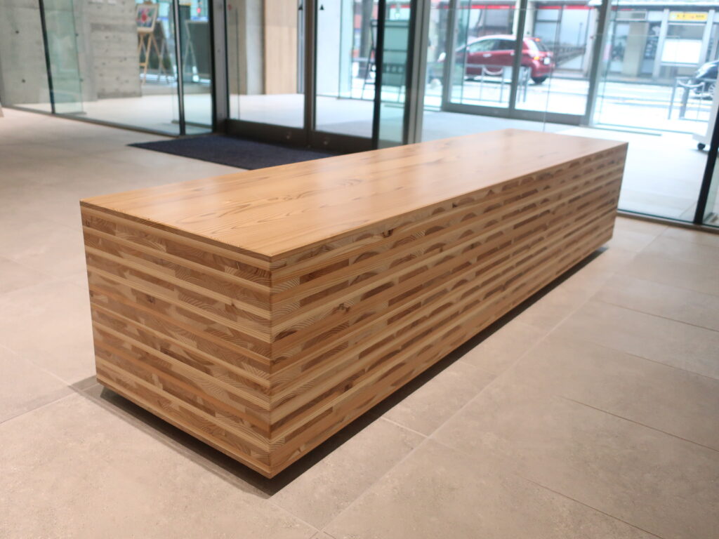 金沢市の中心市街地を形成する百万石通りに位置する明治安田金沢ビル。2025年3月に落成。約8カ月経ったところでお伺いしました。このビルは、会社の経営理念である「確かな安心を、いつまでも」の体現をめざし、建物構造への免震工法採用や建物周囲に歩行空間を確保するなど安全性に配慮され、自然採光や高効率設備機器等の採用により環境性能評価認証(ZEB Ready)を取得、人と地球環境にやさしいビルを標榜されています。また、木材を積極的に活用し、木の温もりが感じられ、このビルで働く従業員のモチベーション向上に繋がる環境づくりにも配慮されています。そのビルの1階エントランスホールの窓囲いに使わているのがCLT36。ミニカウンターなどにも利用されており、柔らかな雰囲気づくりに微力ながら貢献していることを嬉しく思います。