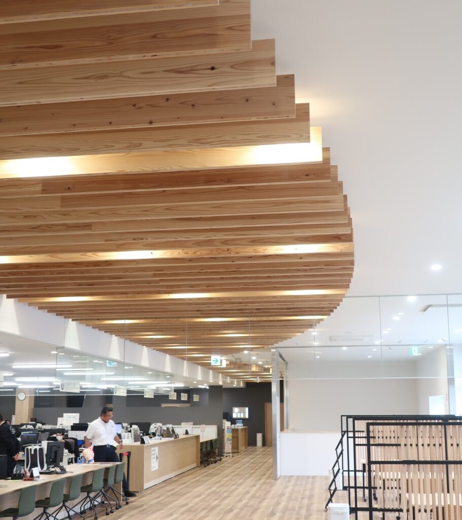 新庁舎の天井ルーバーに地元産材のJパネルが使用された事例(岡山県美咲町)