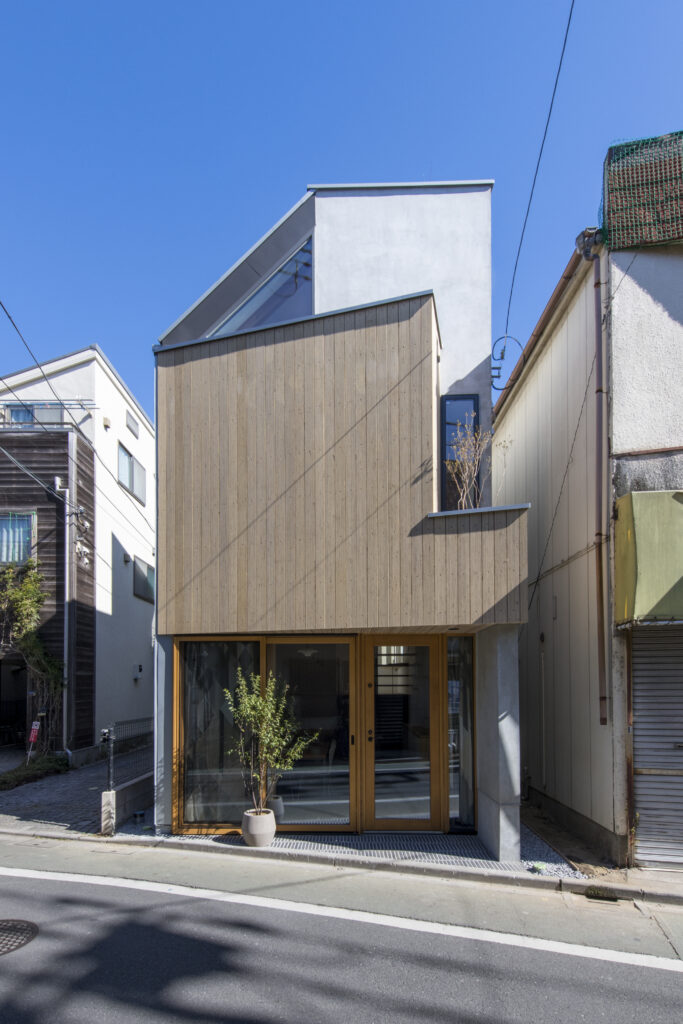 かつて商店街で賑わった東京都三鷹市の通りに建つ事務所併用住宅「井の頭の家」。全体をスキップフロアとしつつ、2階の床をJパネル(36㎜厚CLT)のみで42㎝ごとに段差を設けながら構成。空気的視線的一体感を確保するスリットが設けられています。建物全体は断熱等級6同等の性能で囲われ、床スリットによって内部は大きなワンルームとなり、空気の抵抗が少ない自然換気がもたらされているなど、自然か空気循環が図られています。限られた面積と容積の中で、空間の拡がりと視線・光・風の抜けを確保しながら、1階部分は大きな木製建具で待ちに開かれた事務所として、通りの賑わい復活に寄与されている「井の頭の家」でした。